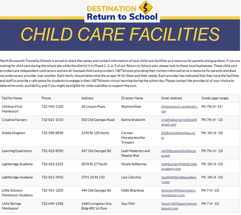 North Brunswick Township Schools is proud to share the names and contact information of local child care facilities as a resource for parents and guardians. If you are looking for child care during the school day while the district is in Phase 1, 2, or 3 of our Return to School plan, please look to these local businesses. These child care providers are independent contractors and are all licensed child care providers. NBTSchools providing their contact information as a resource for parents and does not endorse any provider over another. Each family should determine the proper fit for them and their needs. Each provider has indicated that they have the facilities and staff to provide a safe space for students to engage in their NBTSchools virtual learning during the school day. Please contact the provider(s) of your choice to determine costs, availability, and if you might be eligible for state subsidies to support the cost.